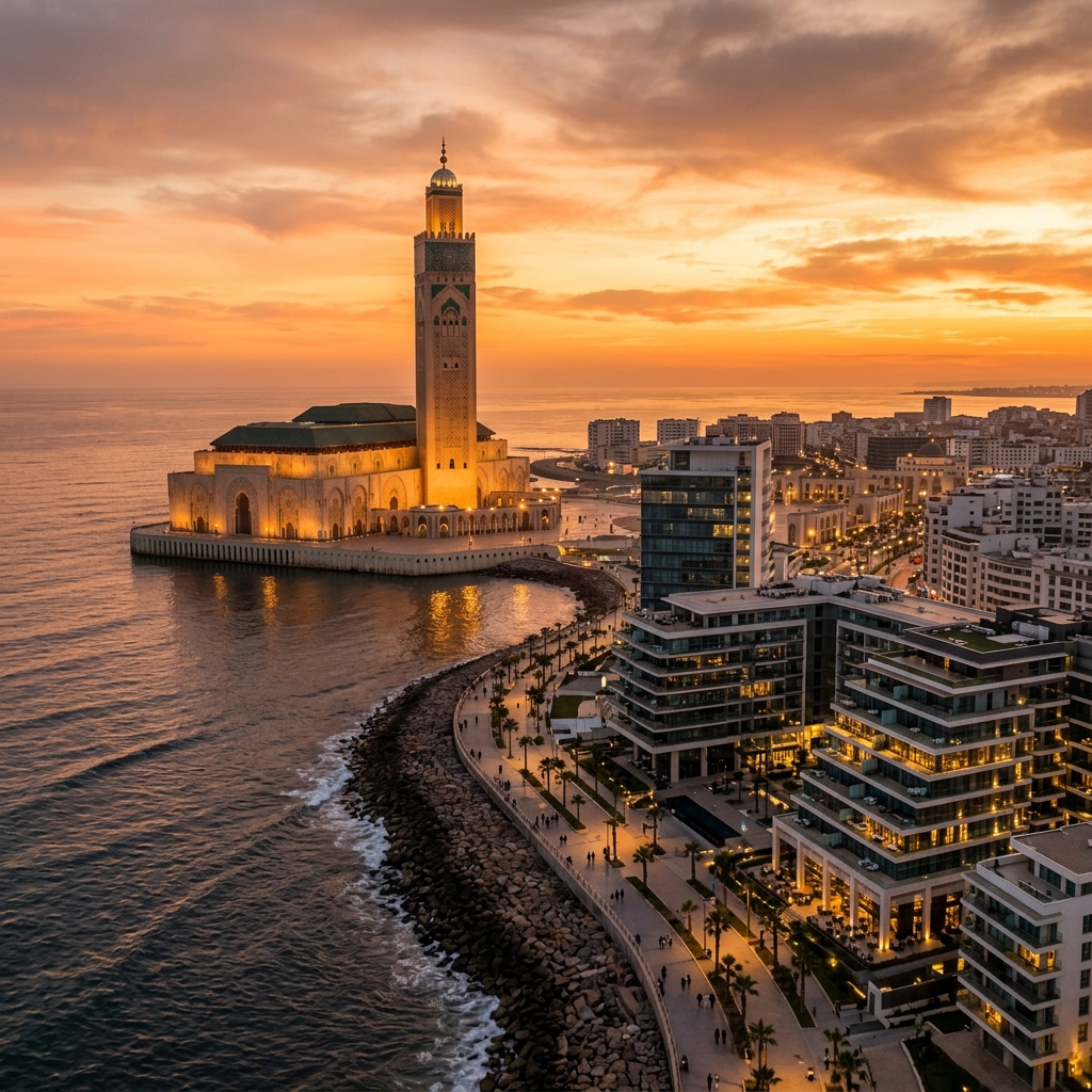 Casablanca est une ville de contrastes saisissants, où les gratte-ciel modernes côtoient les ruelles centenaires de l'ancienne médina. Capitale économique du Maroc, elle pulse d'une énergie créative unique. Ses boulevards bordés de palmiers, son architecture Art Déco héritée du protectorat et sa corniche de 15 km offrent un cadre de vie exceptionnel. La ville abrite des galeries d'art contemporaines, des restaurants gastronomiques et des espaces culturels qui témoignent de son dynamisme.